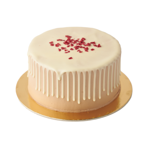 Kakku kuorrutetaan suklaa–voikreemillä, päälle valutetaan valkosuklaa ja koristeeksi lisätään mansikka–suklaarouhetta, mikä viimeistelee kakun näyttävän ulkonäön ja herkullisen maun. Selkeälinjainen ja näyttävä valinta juhlapöytään tai kahvihetkeen.