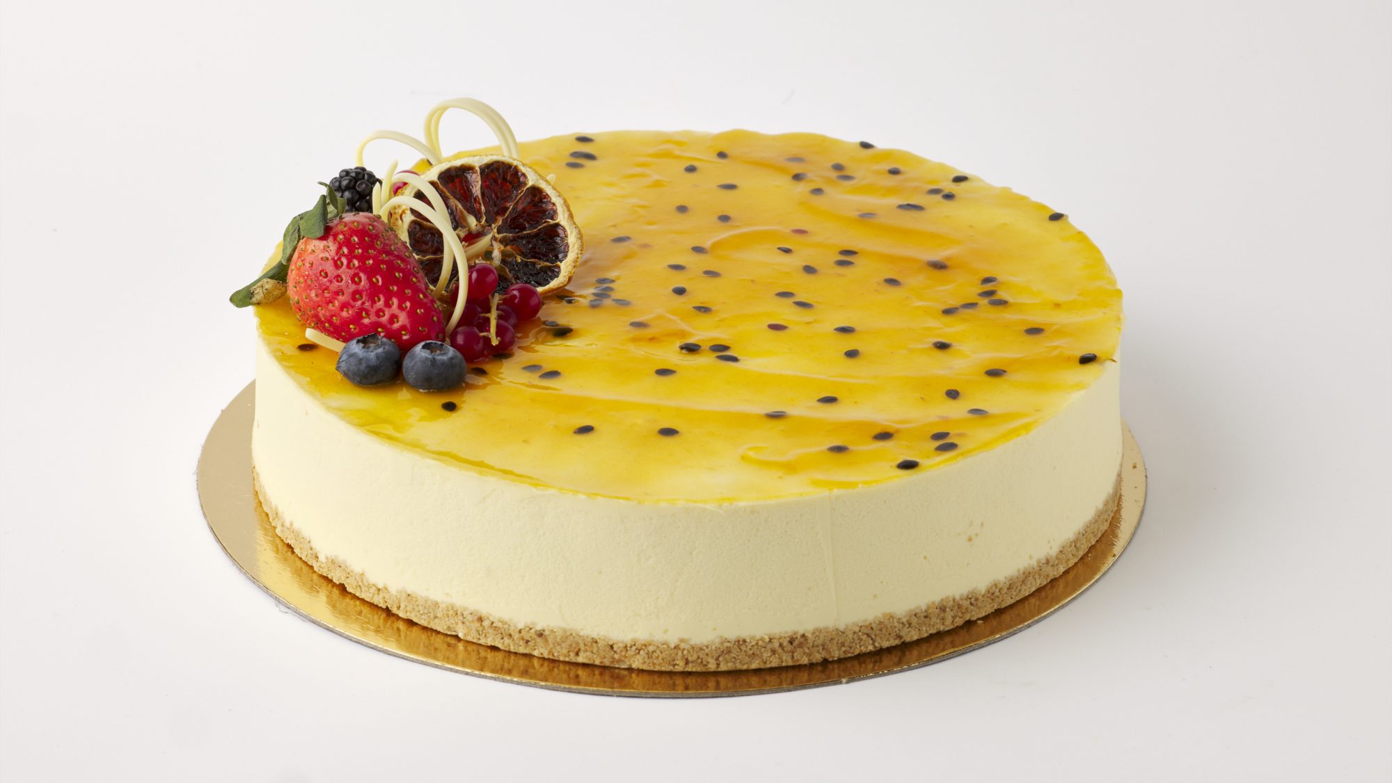 Gluteeniton kaurakeksipohja luo kakulle miellyttävän rakenteen ja kevyen paahteisen sävyn. Täyte on täyteläinen ja aromaattinen passion-tuorejuusto, joka tuo kakkuun raikasta hedelmäisyyttä ja tasapainoisen makeuden.