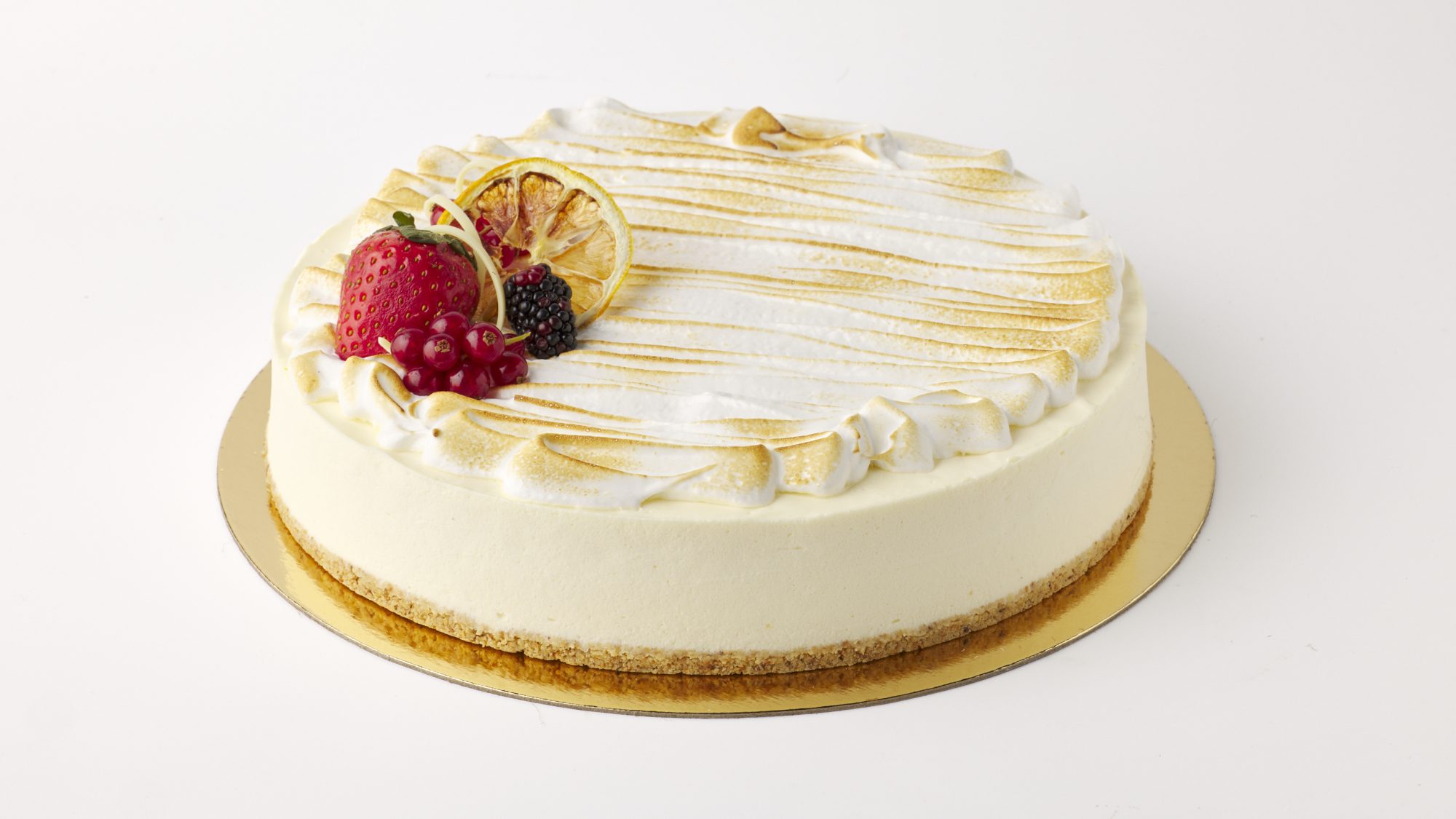 Kakun pinnalla on italialainen marenki ja koristeina marjoja sekä suklaata, mikä viimeistelee kakun näyttävän ulkonäön ja tasapainoisen maun. Selkeälinjainen ja tyylikäs vaihtoehto juhlapöytään tai kahvihetkeen.